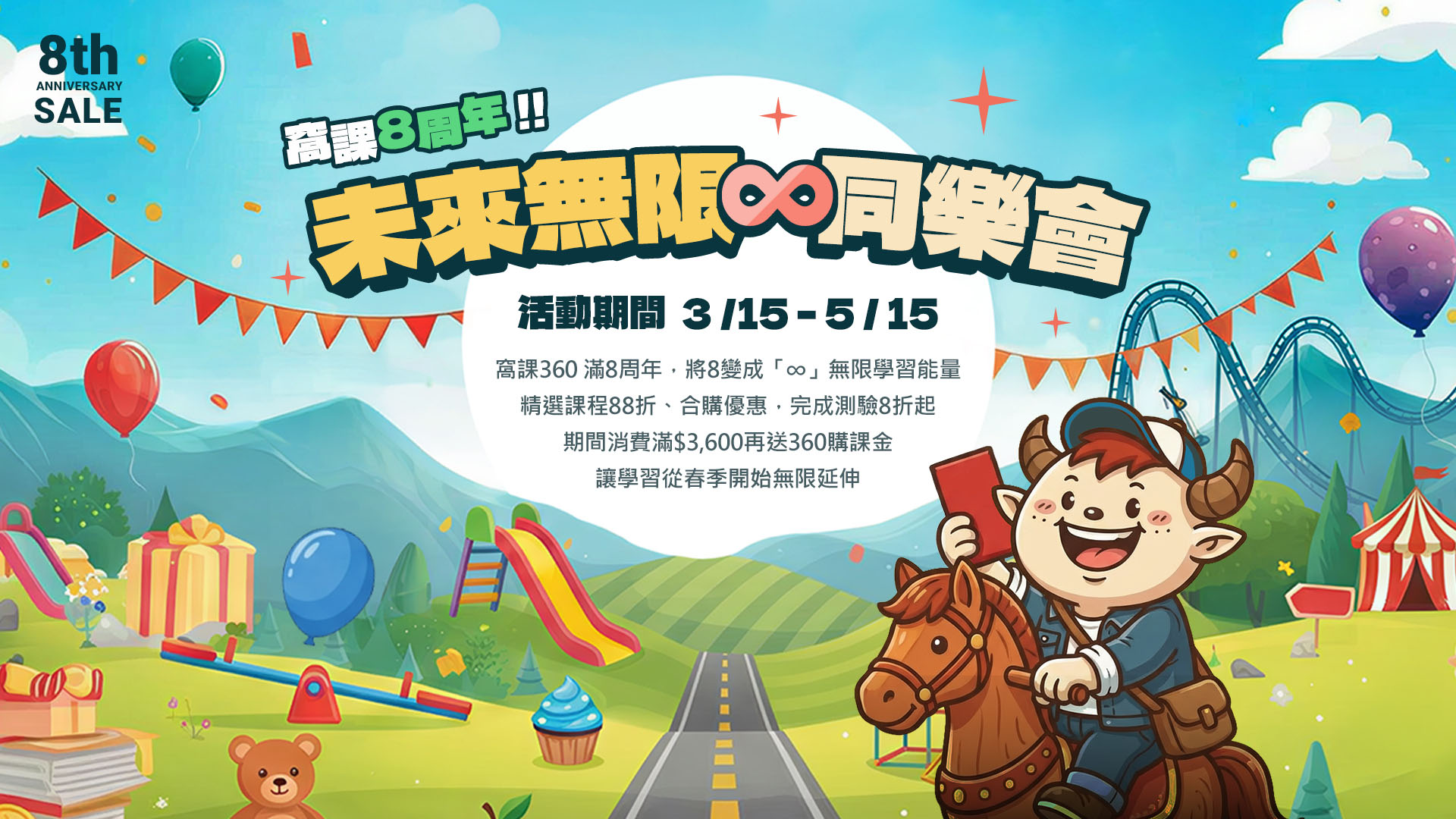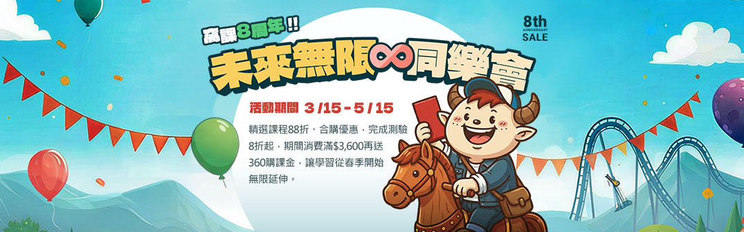 ★ 窩課360滿8周年,將8變成「∞」無限學習能量 ★ 精選課程88折、合購優惠,完成測驗8折起,期間消費滿$3,600再送360購課金