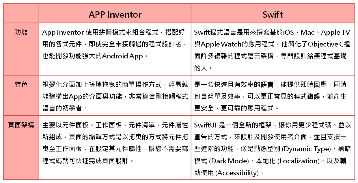 對開發者來說,Swift可以更正常見的程式錯誤,並產生更安全、更可靠的應用程式。SwiftUI 是由 Swift 建構而成,可以使用更少的程式碼來完成複雜的應用程式,並且提供一些進階的功能(例如:夜間模式),和Swift一樣支援所有的平台,所以你的 UI 程式碼能夠在所有平台進行同步。