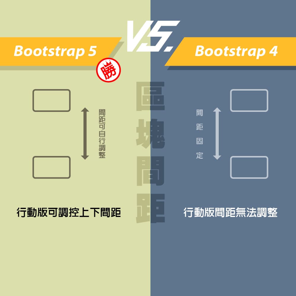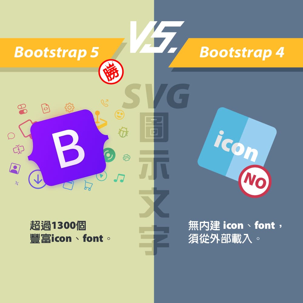 由於Bootstrap一直以來,內建以賴著jQuery,但在Boostrap5.0則正式的告別jQuery框架,進而提升網頁的效能,同時也不會因為要使用新版jQuery的函式,而造成載入新版的jQuery與Bootrap所引用的jQuery版本衝突的冏境,甚至Bootstrap5.0也正式的放棄了對 Internet Explorer(IE)的支援,並且內建Iconfont讓在設計網頁時,無需再載入第三方Iconfont模組與使用版權上的問題,甚至Bootstrap5.0更支援文字字級的RWD效果,讓文字也會隨著裝置顯示尺寸自動的縮放,以及區塊間的距離,也提供新的設計屬性,只需修改HTML的標籤,就可讓區塊在行動版時,不會上下黏在一起,同時Bootstrap5.0讓網頁截入速度更快。