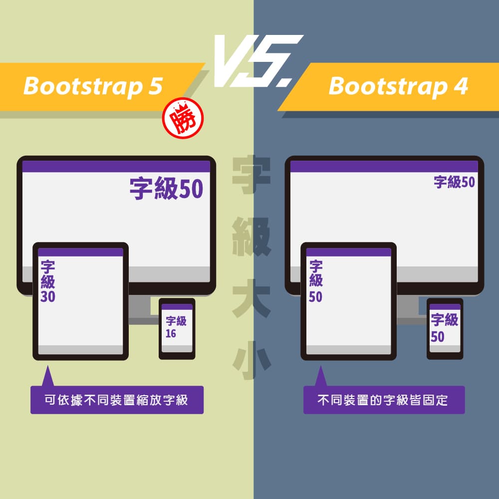 文字對於RWD一直是許多人心中的痛,由於文字不像圖片,擁有自動縮放的功能,因此就得全手工的方式,自行的設定文字在什麼裝置底下,標題、內文、備註...文字字級,是一件相當麻煩的事,但現在透過Bootstrap5.0後,內建就已提供文字RWD響應式的效果,讓文字可隨著裝置自行的縮放調整。