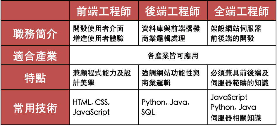 「軟體工程師」是在科技業中一直十分活躍的角色!但是其實這個名稱是泛指不同角色的工程師呢!大方向來說軟體工程師分為「網頁開發」及「 APP 開發」,而網頁開發中又可以細分為「前端」、「後端」、「全端」工程師,今天這篇文章就讓我們深入了解這三種軟體工程師工作內容吧!