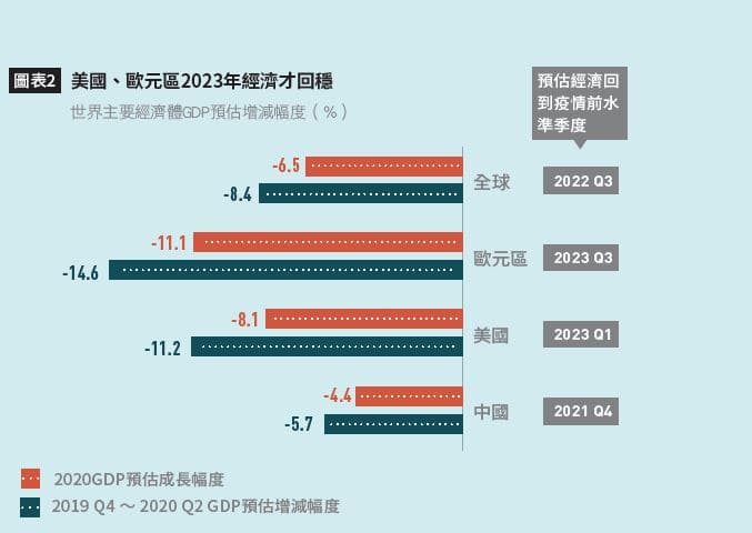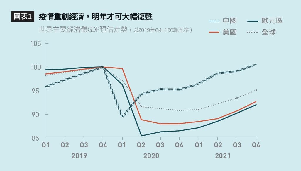 首先,是比較樂觀的情況,若各國採取積極的防疫政策,疫情會在6月趨緩,但經濟狀況受到大規模隔離、旅遊禁令影響,企業或消費者支出都會大幅下降。預估恢復速度較快的亞洲地區,供應鏈要到第3季才有起色,歐美則要等到第4季。但較悲觀的預測則是,各國防疫策略效果不彰,或恢復經濟活動之後,爆發二次群聚感染,歐美地區確診人數持續創高,就連可能已經控制住疫情的東亞國家,也得持續實施防堵政策,避免疾病再度流行,經濟將因此加速惡化,全球經濟受損的程度逼近2008年的金融海嘯。