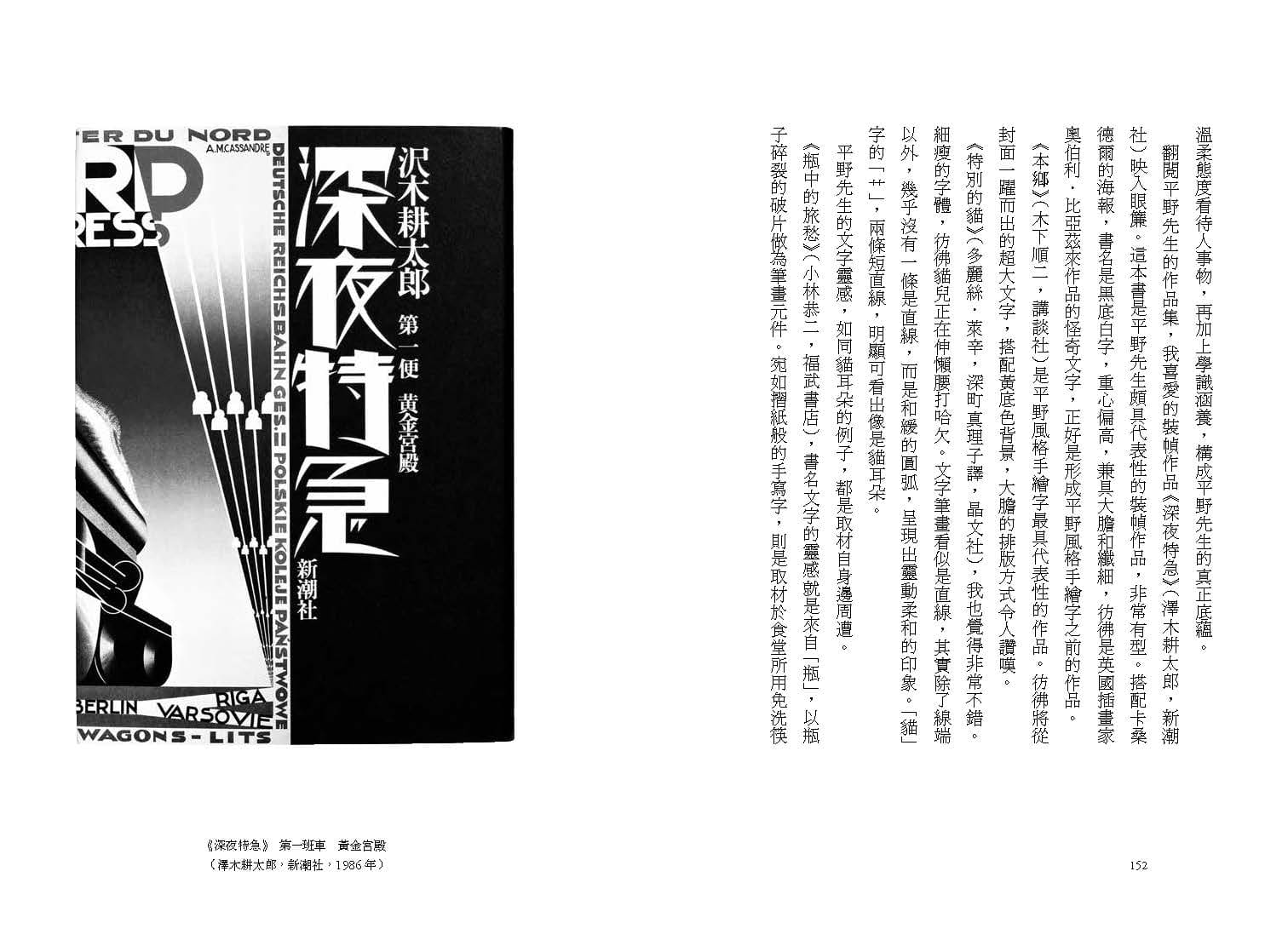 翻閱平野先生的作品集,我喜愛的裝幀作品《深夜特急》(澤木耕太郎,新潮社)映入眼簾。這本書是平野先生頗具代表性的裝幀作品,非常有型。