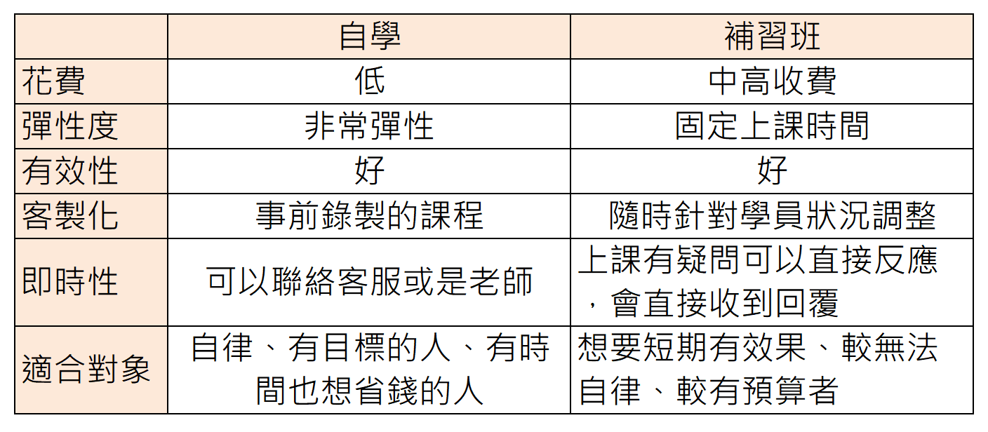 初期學習外語,想必大家都會有個疑問,到底要自學,還是花大錢上補習班?我認為兩種方式都能有效達到一定的語言程度,然而依照個人的時間、預算、目標、個性,需要選擇比較適合自己的學習方式: