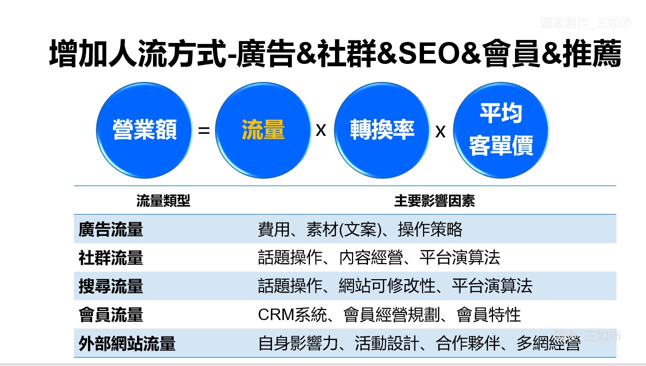 「廣告流量」的主要影響因素在於廣告費用、廣告素材、廣告投放操作策略;「社群流量」主要看你如何操作話題、如何操作內容經營,同時注意平台演算法;「搜尋流量」則與SEO有關,你的網站可修改性和在搜尋引擎中的演算法都會影響流量;「會員流量」著重在會員經營,針對不同的會員特性去優化CRM系統(客戶關係管理);最後是「外部網站流量」,你的品牌影響力、活動設計、合作夥伴、多網經營等都是影響因素。