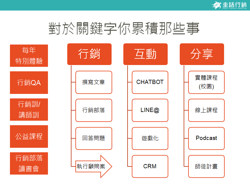 找到自己人生中想要累積的三個關鍵字,小圭老師自己的三個關鍵字為:「行銷、互動、分享」