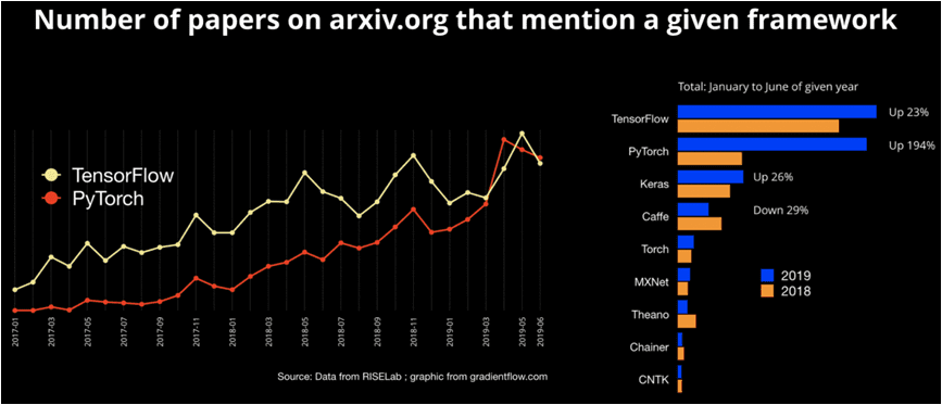 上圖為各種深度學習框架在Arxiv網站的論文採用比率。官方的教學資源主要有兩個頁籤『教學』(Tutorial)與『指南』(Guide),建議讀者先從『指南』入門,而非『教學』,教學其實是針對影像/文字/音訊作專題式的介紹。