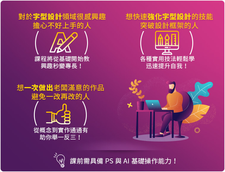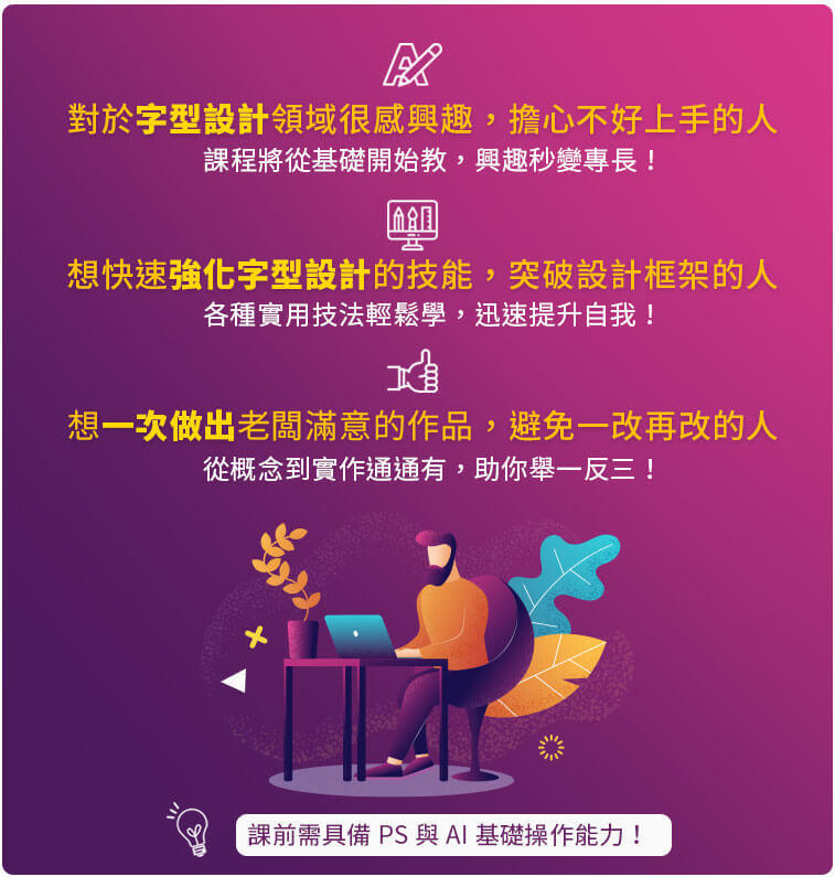 若你是設計相關科系,這堂課能幫助你加強字型設計技能;即使非本科系,但你對平面設計、商業設計、網頁設計有興趣,也能輕鬆從課堂中學習文字的視覺應用。