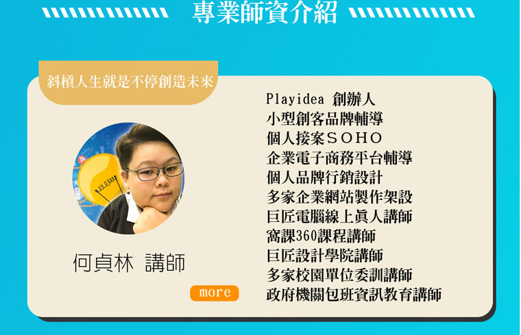 玩子老師經營 Play idea 玩創意個人工作室,業界經驗豐富,教學經歷也有二十幾年以上,平時上課喜歡與學生互動,在陪伴學習的過程擔任亦師亦友的角色,教學相長,成效斐然。
