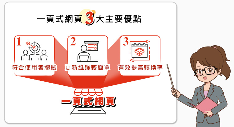 一頁式網頁符合現今人們常使用手機的習慣,往下滑便可瀏覽整體網頁資訊;而因為只有一個網頁,使得更新與維護都相對網站而言更為簡單;並且當使用者瀏覽網頁時,不會出現其他按鈕跳轉到其他頁面,只要動線設計巧妙,可藉此提高轉換率。