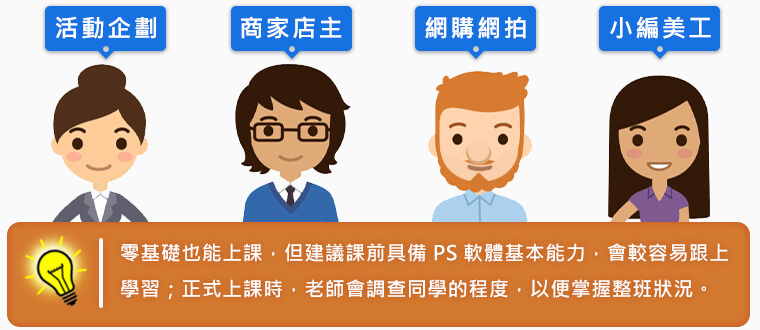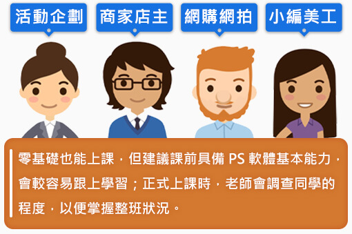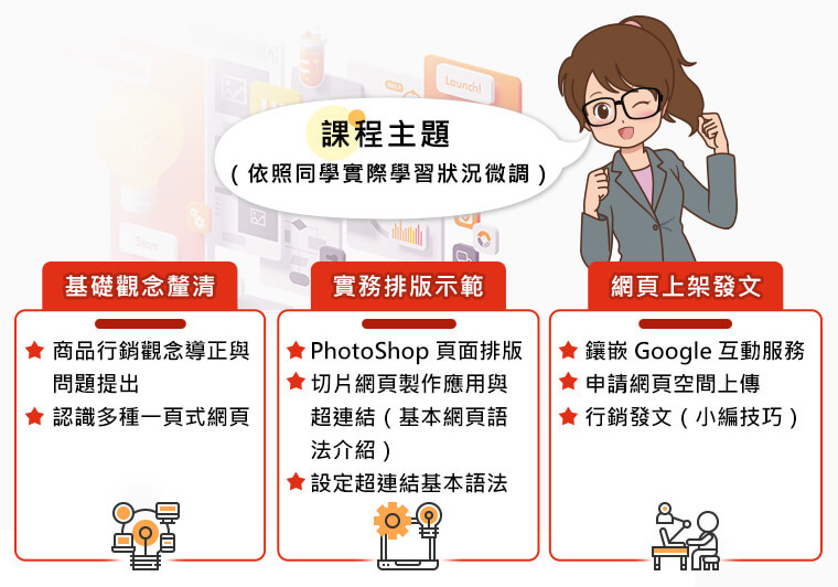 課堂中,老師會先帶你了解商品行銷與一頁式網頁的基本觀念。接著,進到實際範例示範,解析實用、精美的頁面排版方法,以及善用 PhotoShop 設定語法連結,完成一頁式網頁設計。最後,則告訴你網頁完成後的上架步驟,讓你能將精心設計的網頁成品上傳到網路上供人瀏覽。