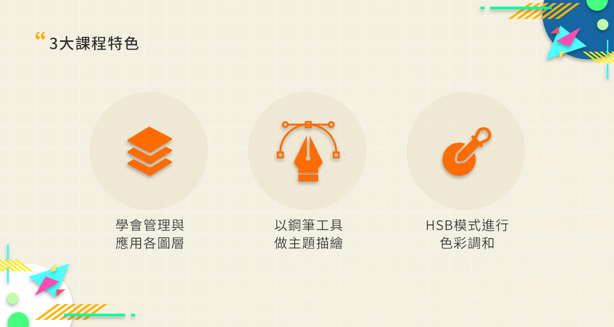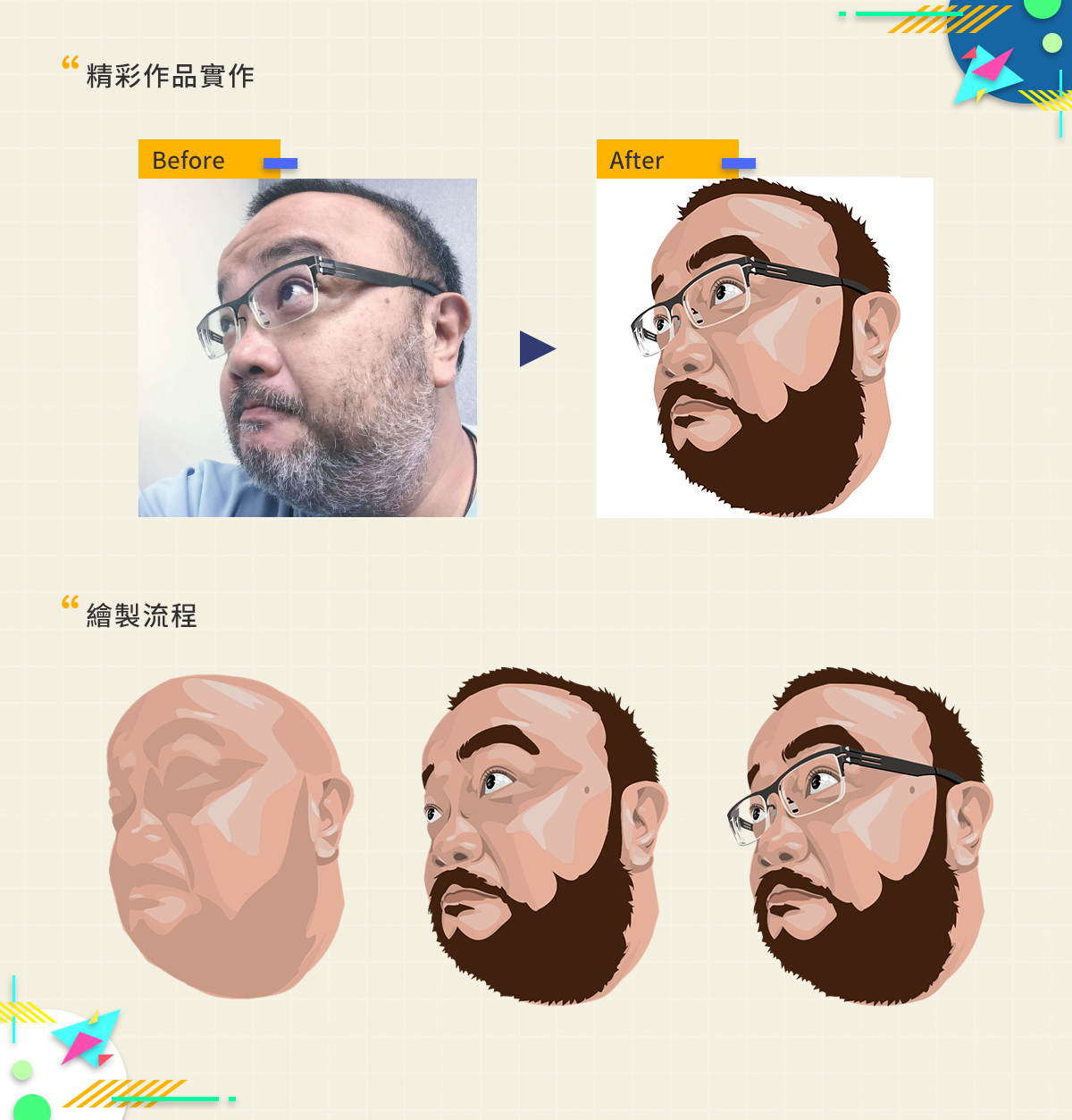 如果要想靈活地應用軟體工具,必須先對軟體有了初步認識,進而熟練操作、深入了解,最後得以靈活應用軟體,繪製出理想中的圖形,發揮個人創意與想法。因此,本課程將幫你打穩Illustrator軟體中鋼筆工具與顏色調和的操作基礎,熟練鋼筆工具的應用與色彩的調和安排,並進行以自己作為範本的彩圖描繪,以專業的態度完成彩色人物的繪製。