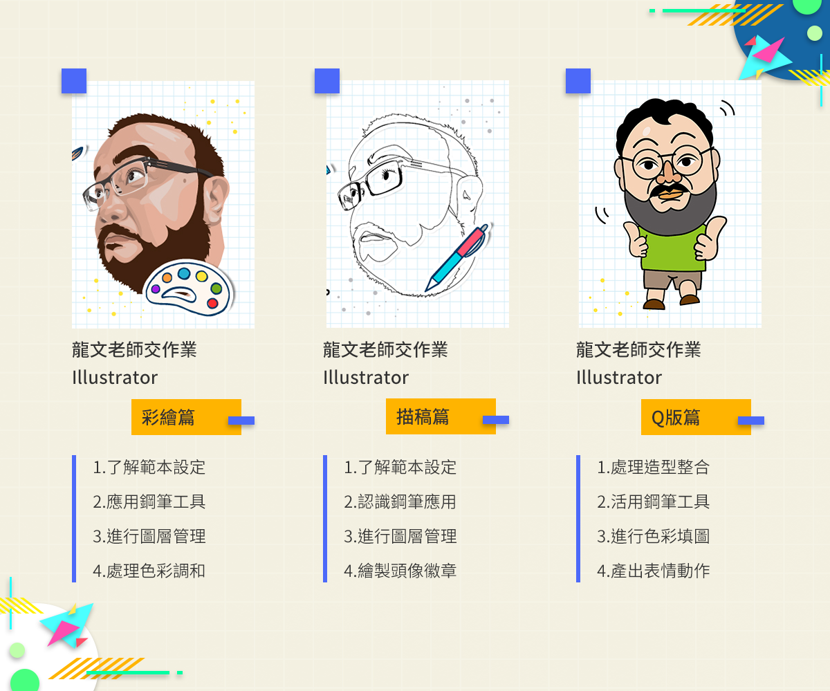 Illustrator(簡稱「AI」),是Adobe公司推出的向量圖形製作軟體,專供專業繪製、完稿、排版、組列等。目前軟體也整合了文書處理、上色等功能,廣泛應用在插圖製作與印刷品(如廣告傳單、小冊子)設計製作方面。本課程教學如何使用鋼筆工具與顏色調和進行範本的自我描繪,以專業的態度完成彩色人物繪製。不僅熟練軟體的使用,更帶你畫出個人的彩色頭像。