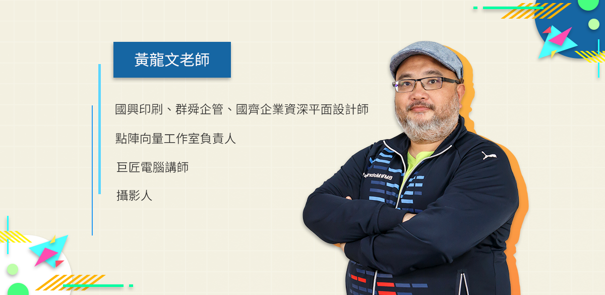 黃龍文老師非常擅長影像處理領域,曾任各企業的平面設計師,現任巨匠電腦的講師,授課時數多達40000小時,教學經驗相當豐富。本身即專精於影像處理、專業攝影、繪圖設計、文件印刷排版等範疇,並於各領域皆有多年的授課經驗,此外更持有ACA認證——Photoshop、Illustrator、InDesign,擁有厚實的專業實力。目前教授的軟體包含:Photoshop、Illustrator、InDesign、CorelDRAW等。