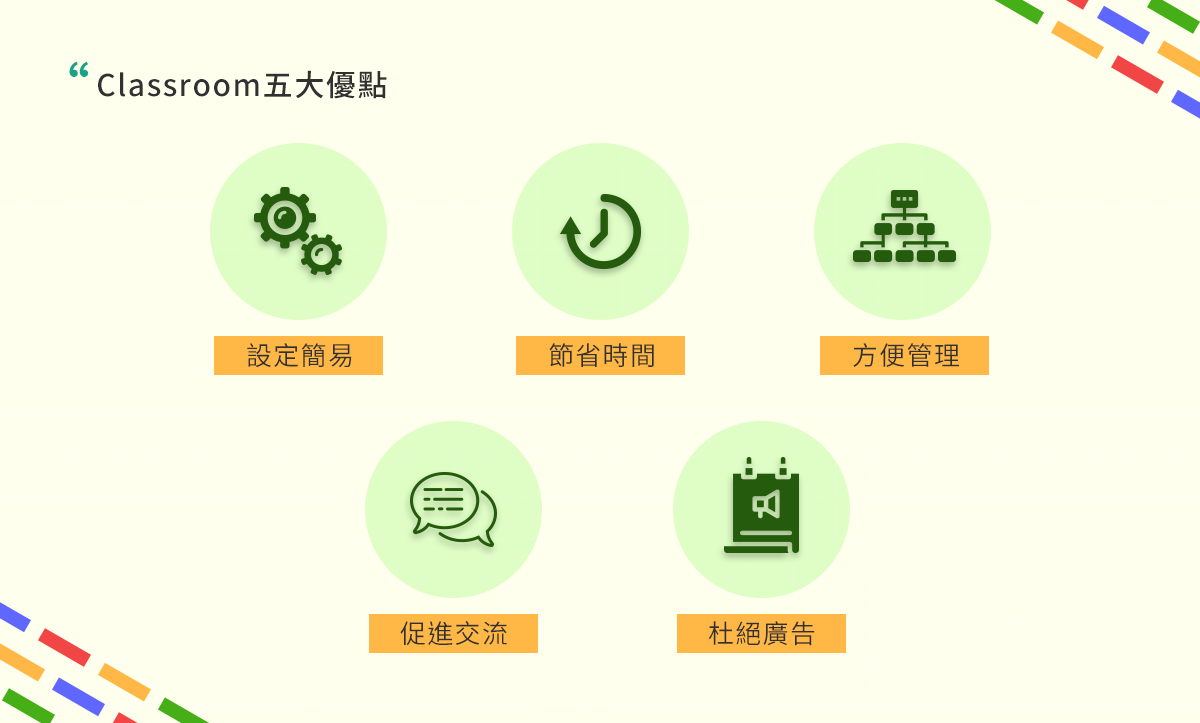隨著網際網路的發展,教學也不再受限於時地,雲端教學正是一大趨勢,Google Classroom因應而生,提供老師和學生們一個便利的教育資源平台。有了Classroom,無論是在校內或校外都能輕鬆溝通,任何時間都能自由學習。同時更方便老師建立課程、指派作業、通訊聯絡與管理班級檔案,減少老師花費在課程雜務的心力,而有更多時間準備課程內容,有效提升教學效率與品質。趕緊跟上雲端教學的趨勢,讓師生互動更緊密吧。