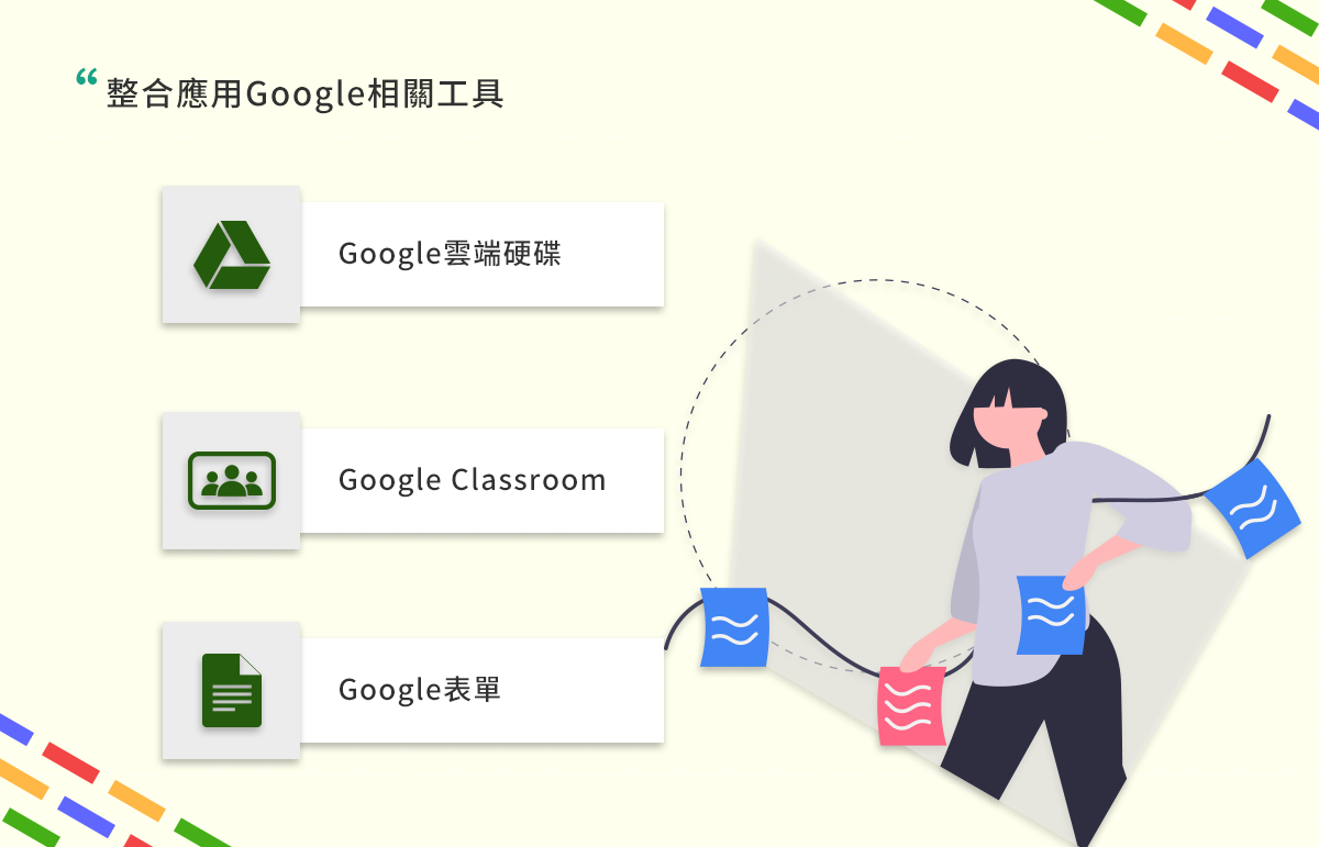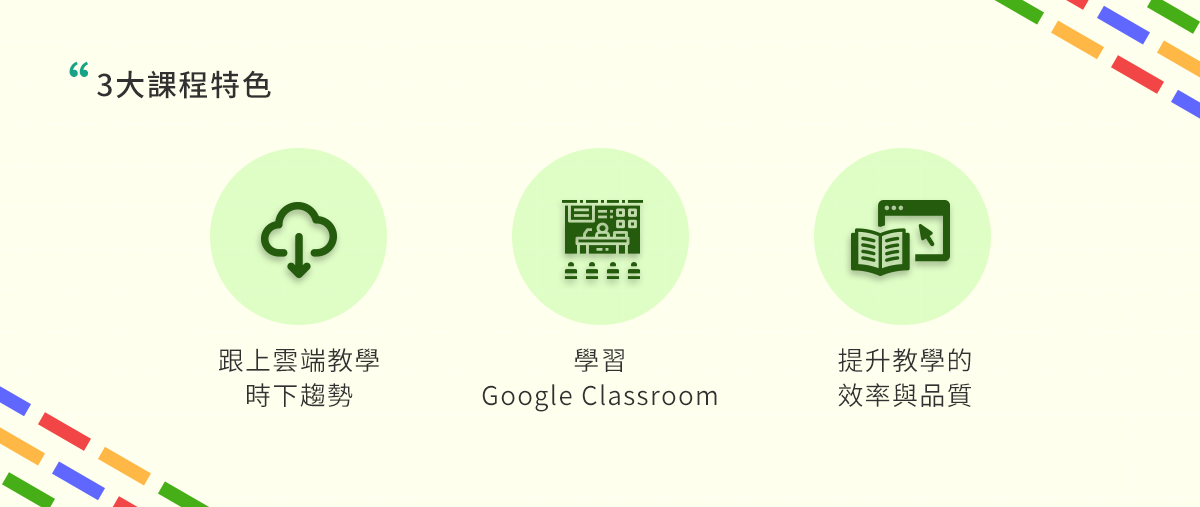 課堂上將循序漸進地教你如何應用Google Classroom來實踐雲端教學,讓你再也不用為了分享資料給別人,以及收集別人的資料或作業而傷腦筋!Google提供了很多的方式讓你能輕鬆完成「檔案分享」、「資料收集」、「繳交作業」。而在本課程中,也將教你如何整合應用「Google雲端硬碟」、「Google Classroom」和「Google表單」,解決你在Google Classroom平台使用上所遇到的任何問題,掌握雲端教學的應用秘訣。