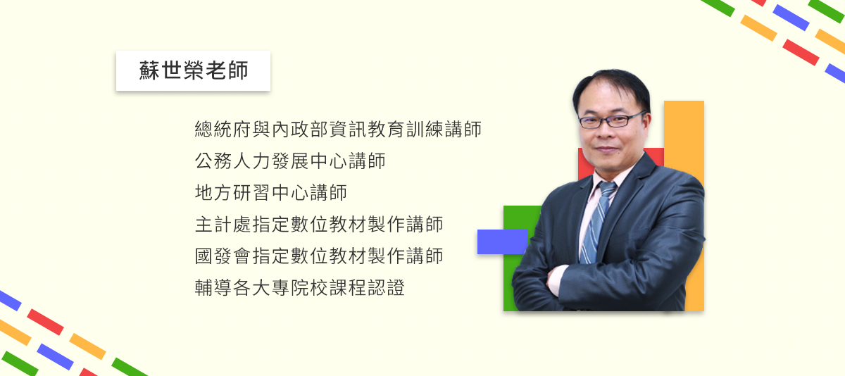 蘇世榮老師的專業強項在於辦公室文件(Office軟體)的資訊化與快速整合運用,以及ODF導入和轉檔,教學時相當擅長以實際案例將複雜內容清楚表達,並在各個政府機關和大專院校擔任過專任講師,長年致力於教學,經驗相當豐富,教齡長達25年,更有眾多精采的著作。