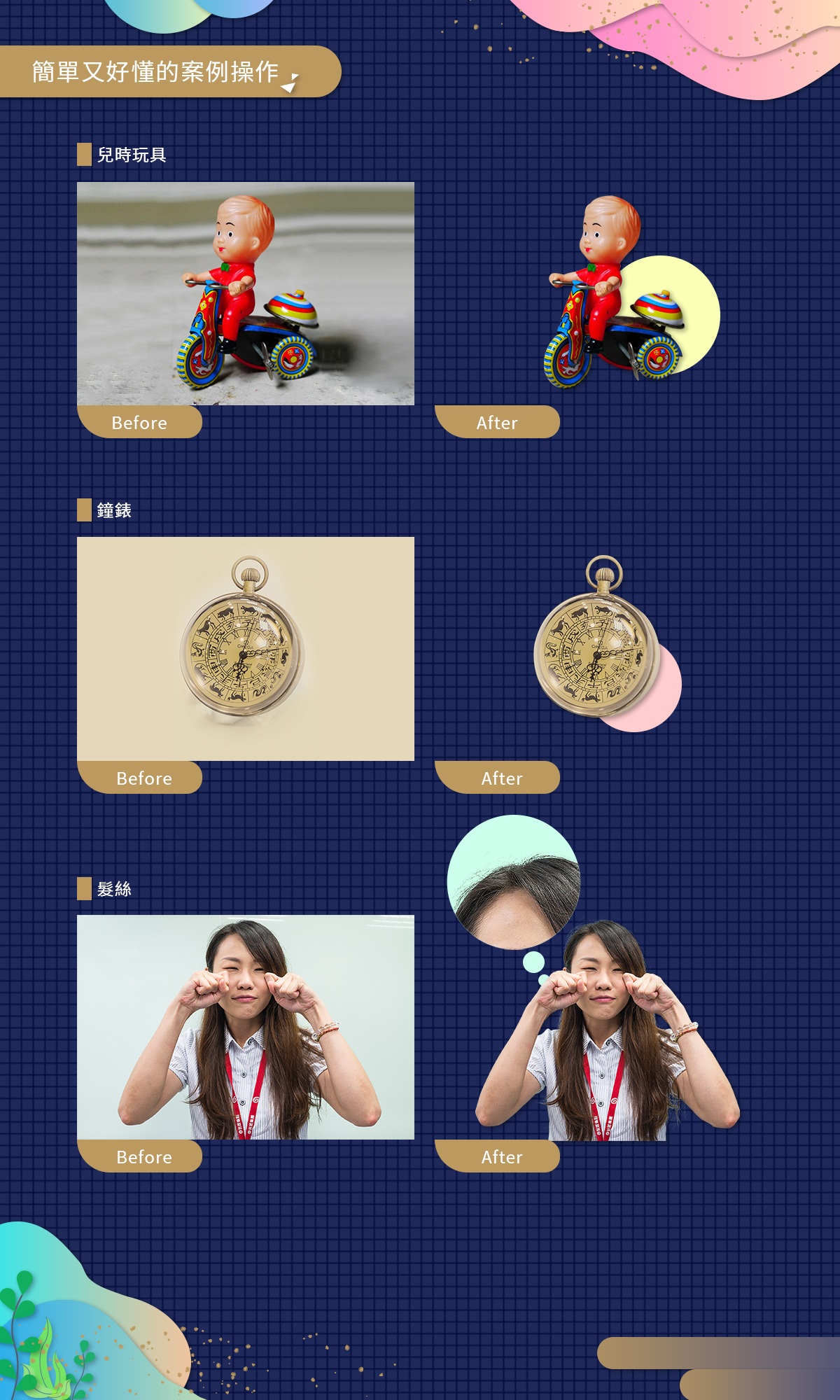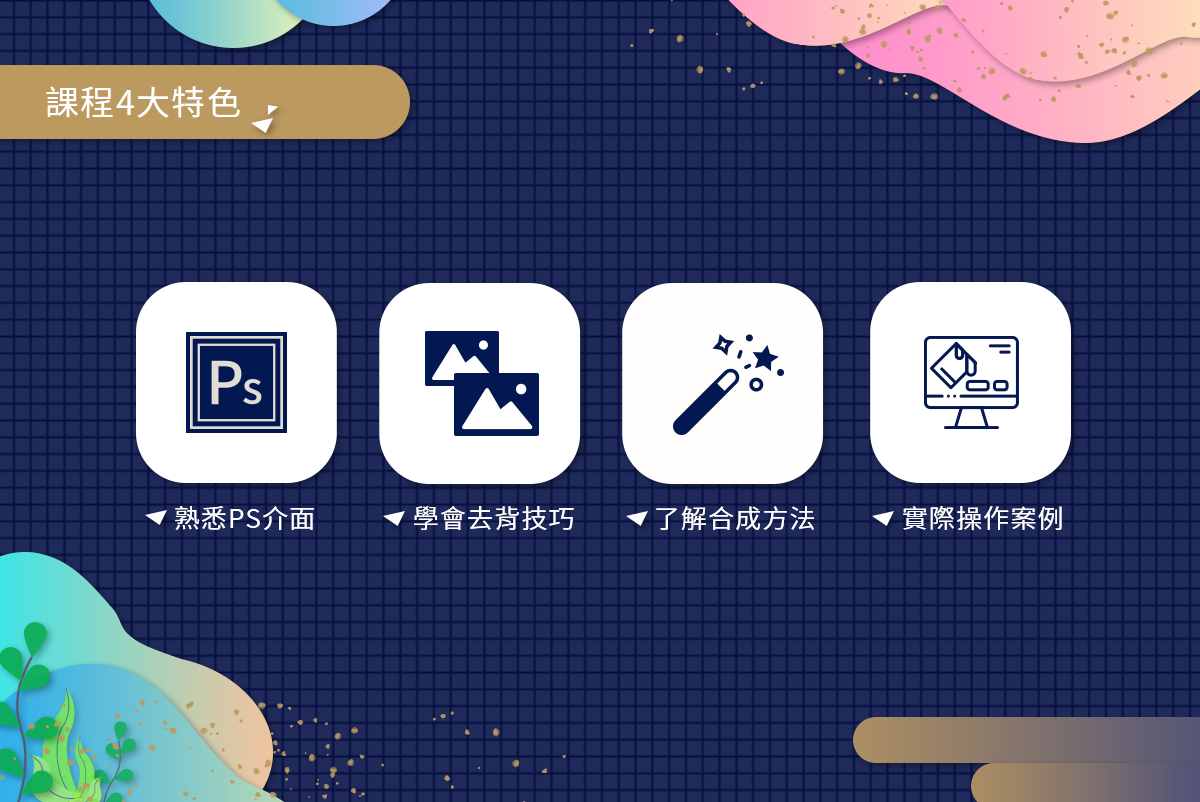 本課程將以豐富多元又簡單好懂的案例示範,案例包含鐘錶、兒時玩具與髮絲等各式物件的去背與合成,細部拆解每一個處理步驟,讓你在實際操作與練習的過程中,不用擔心難度過高跟不上的問題。只要跟著老師的操作動作一步步實際演練,加深學習印象,輕鬆記憶,就能掌握處理訣竅,逐漸了解圖片去背的原理與各種活用的方法!