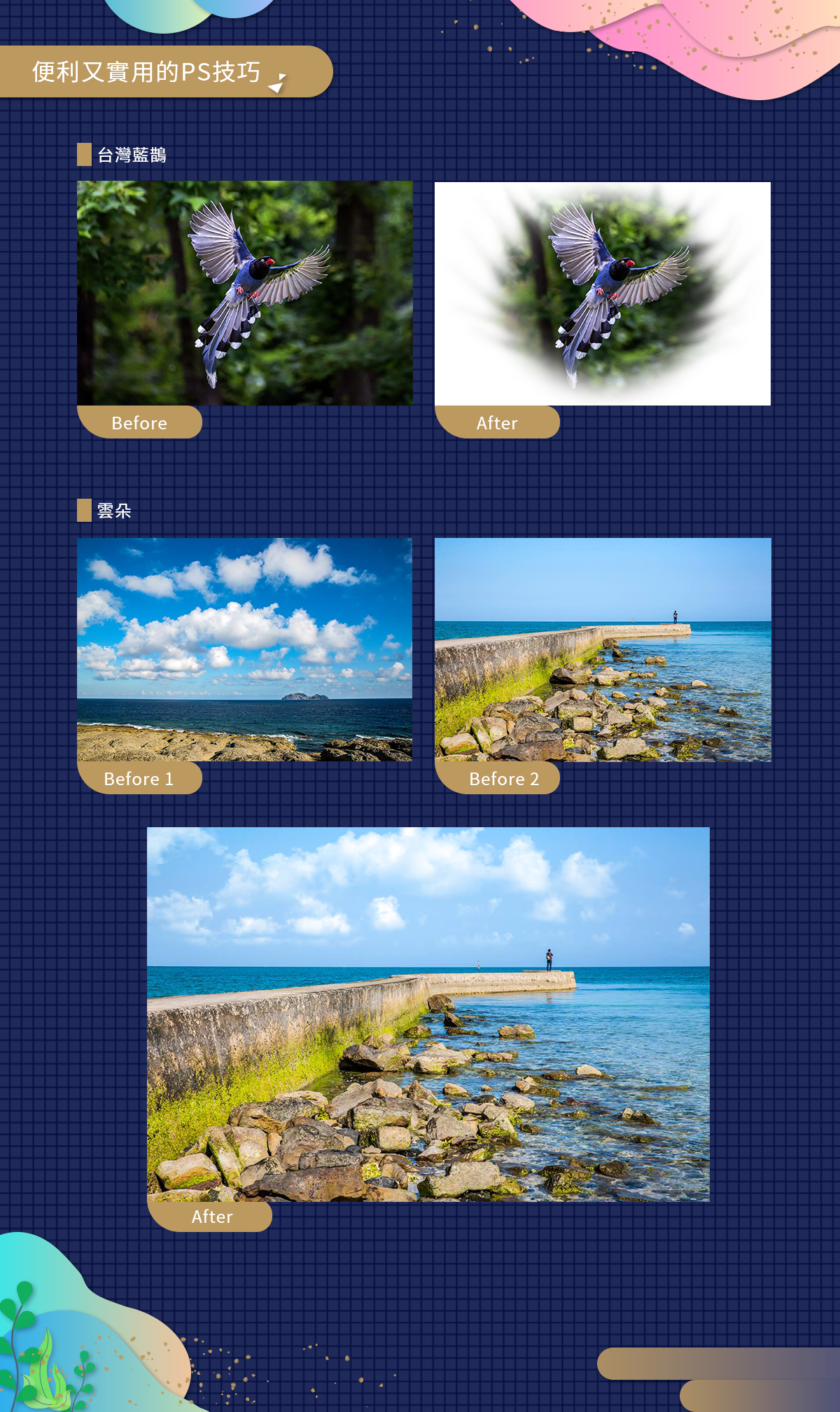 因此本課程除了教學如何圖片去背,還教你如何在去背之後,將去背後的圖片與其他圖片進行合成,包含雲朵的去背與合成,將雲朵從天空的照片撥離,然後合成在另外一張人物情境照之中,讓照片更加豐富。另,也教你其他實用的小技巧,例如柔化邊緣等,迅速修出好圖片。