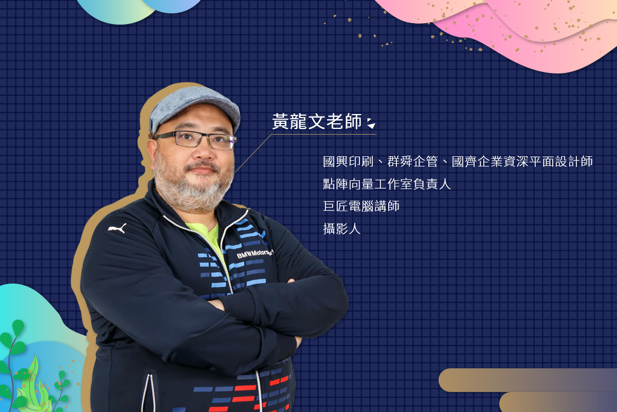 影像處理大師黃龍文老師,現任巨匠電腦的講師,授課時數多達40000小時,教學經驗相當豐富。本身便專精於影像處理、專業攝影、繪圖設計、文件印刷排版等範疇,並於各領域皆有多年的授課經驗,此外更持有ACA認證——Photoshop、Illustrator、InDesign,擁有厚實的專業影像處理實力。目前教授的軟體包含:Photoshop、Illustrator、InDesign、CorelDRAW等。