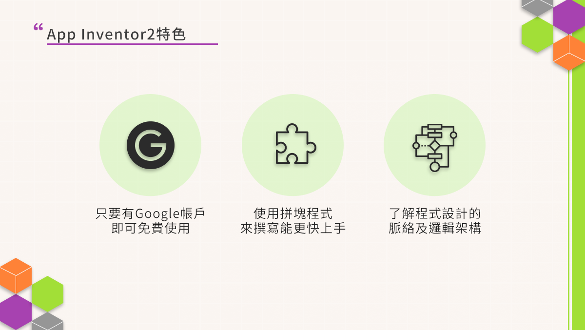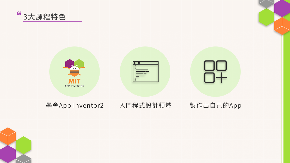 App Inventor2操作簡單,更避免使用難懂的程式設計語法,所以相當適合想要入門程式設計領域的初學者學習,而本課程將針對App
