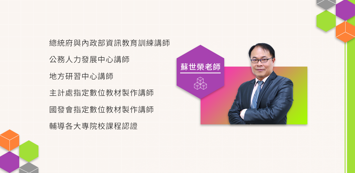 蘇世榮老師的專業強項在於辦公室文件(Office軟體)的資訊化與快速整合運用,以及ODF導入和轉檔,教學時相當擅長以實際案例將複雜內容清楚表達,並在各個政府機關和大專院校擔任過專任講師,長年致力於教學,經驗相當豐富,教齡長達25年,更有眾多精采的著作。