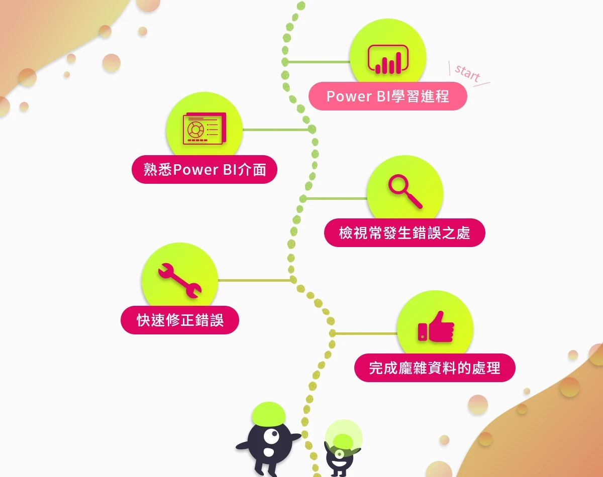本課程帶你逐步熟悉Power BI介面,建立正確的資料處理觀念,並且教你如何一一檢視常發生錯誤的地方,像是如何找出重複的資料、如何避免資料輸錯列、如何避免資料輸入錯誤等,並快速修正。讓你熟練使用Power BI,迅速檢查內容,面對龐雜資料的處理不再是一大難題。