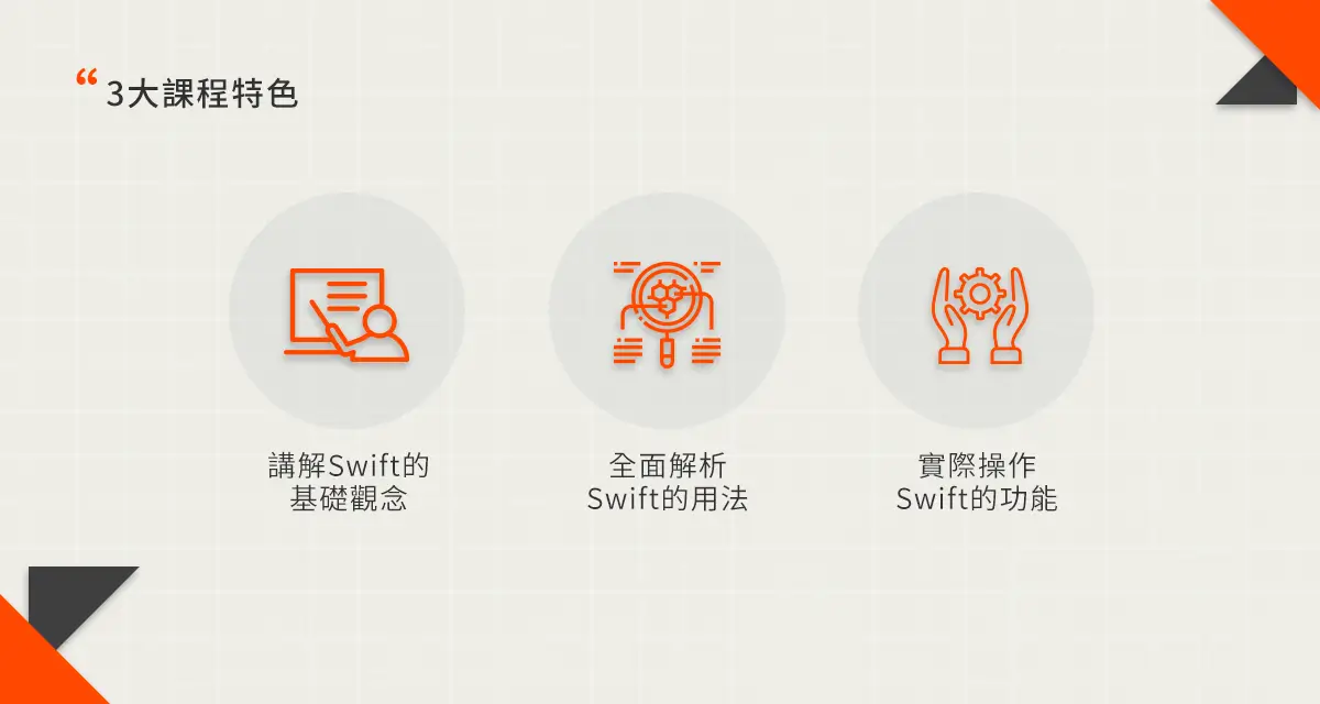 課堂上,老師將從Swift的基本概念教起,再逐一講解Swift程式語言的各大開發要點,帶你快速入門這款好用易學的程式語言。課程的重點內容包含了Swift觀念、基本運算子、字串與字元、集合物件、流程控制、函式和閉鎖以及結構與類別,全面講述了Swift程式語言的使用方法,幫助你在學習上紮穩根基,日後活用在開發App時,可以盡情發揮、輕鬆運用,創作出理想中的作品。