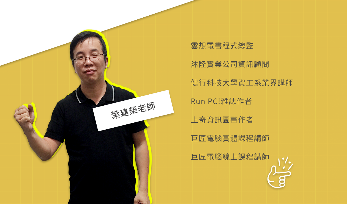 葉建榮老師已有10年以上的電腦教學資歷,專長領域為AI人工智慧程式設計、視窗程式設計、資料庫網頁設計領域,具備Microsoft AI人工智慧多項專業認證。過去曾擔任過幾間大學的業界講師,協助慈濟科大與慈院法人進行Python程式運用介紹與網站架構的協助,協助Getac工業電腦發展影像分析、協助國發會進行Python課程推廣。授課時,著重將理論與實際結合,以簡明扼要與深入淺出的說明加深學習印象,讓學員能輕鬆學習。