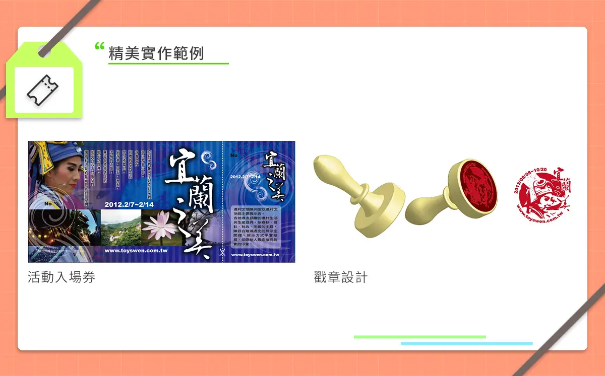 商品設計是指經過完整的設計流程與創意發想,將一件商品從無到有的製作出來!而本課程以戳章與活動入場券的範例設計為主,結合Illustrator與Photoshop繪圖軟體教學,包括Illustrator影像描圖與路徑文字工具、Photoshop影像合成方法等。在老師的帶領下,講解由淺入深,逐步認識商品的製作流程與方法,同時配合範例演練,設計出獨一無二、極具特色的戳章與活動入場券。