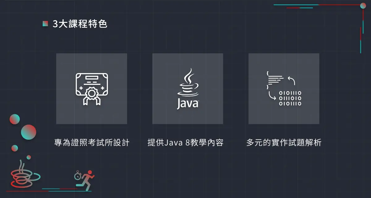 本課程專為想參加Oracle Java 8國際認證考試的人所設計,輔佐考取證照。