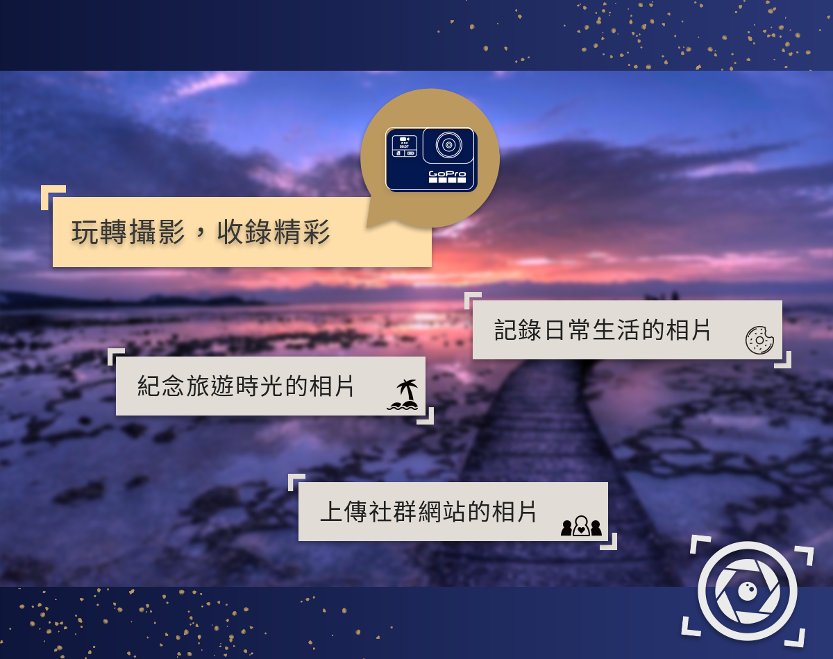 現代人習慣以拍照收藏快樂時光,無論是日常有趣的小事,或蘊含意義的旅遊,通通化成一張張精美圖像,上傳到社群網站分享。所以,拍攝工具便顯得重要,若想隨時可拍、方便攜帶,加上畫質喜人,那GoPro相機可說是不二選擇,還可以結合Photoshop等軟體修出更美觀的照片。有鑑於此,本課程將介紹GoPro相機使用方法,教你玩轉攝影,收錄精彩!