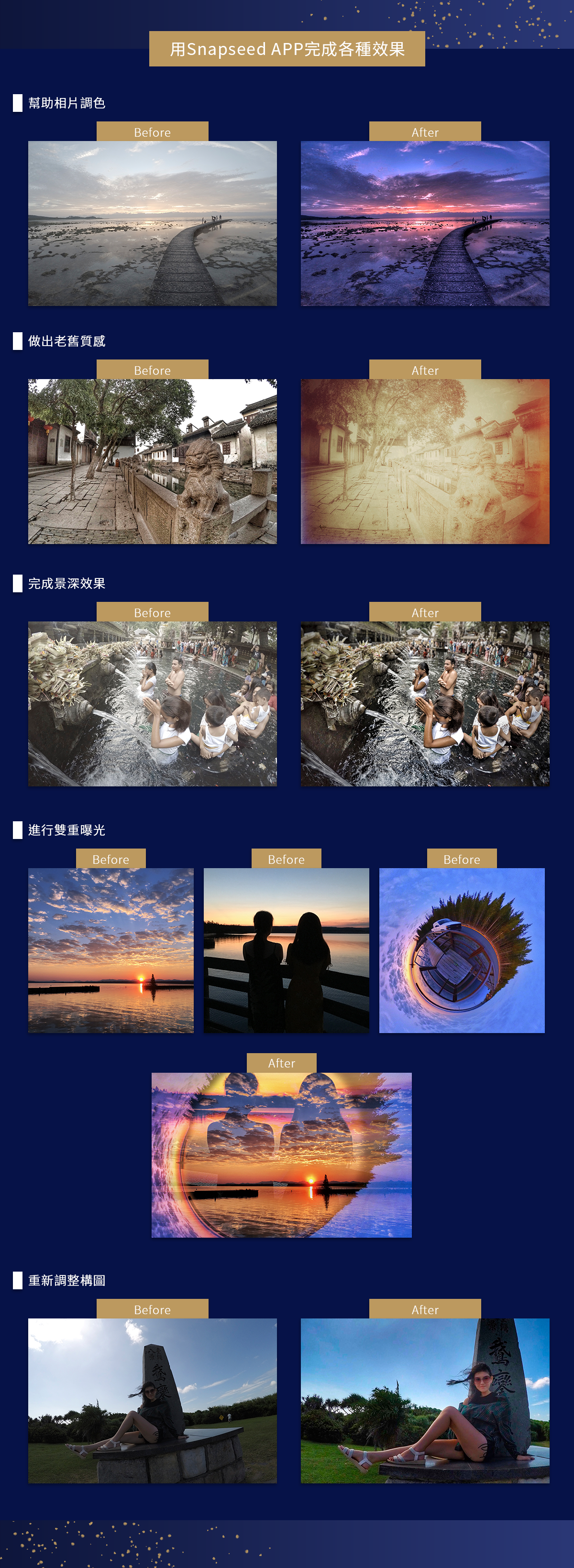 為了讓照片獨樹一幟,有個人風格,你可以用APP軟體拍照或修圖。網上這類軟體不少,本課程將介紹兩個好用的APP:Snapseed APP與POCO相機,教你如何使用它們幫相片調色,或做出老舊質感,或完成景深效果,或進行雙重曝光,或重新調整構圖,使拍攝的相片臻至你心目中的樣子,不僅更傳神,也更引人入勝,打造令人眼睛為之一亮的大師級相片。