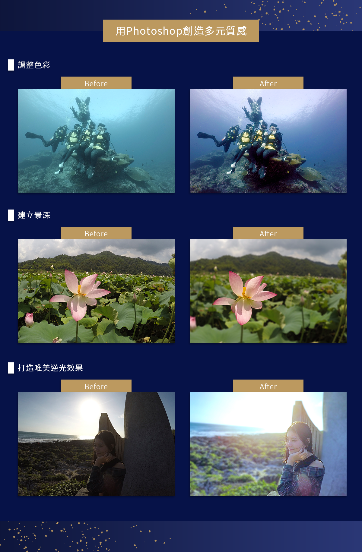 除了APP軟體,Adobe公司出產的Lightroom、Photoshop軟體也是你修整相片的好幫手!Lightroom軟體主要是用來幫助專業攝影師進行相片的後期製作,屬於Photoshop系列軟體;而Photoshop則是一款多功能影像處理軟體,可有效進行圖片編輯或繪製的工作。本課程將介紹LR、PS兩款實用軟體,教你如何進行相片編修、調整色彩、建立景深,以及打造唯美逆光效果,讓相片獨具特色。