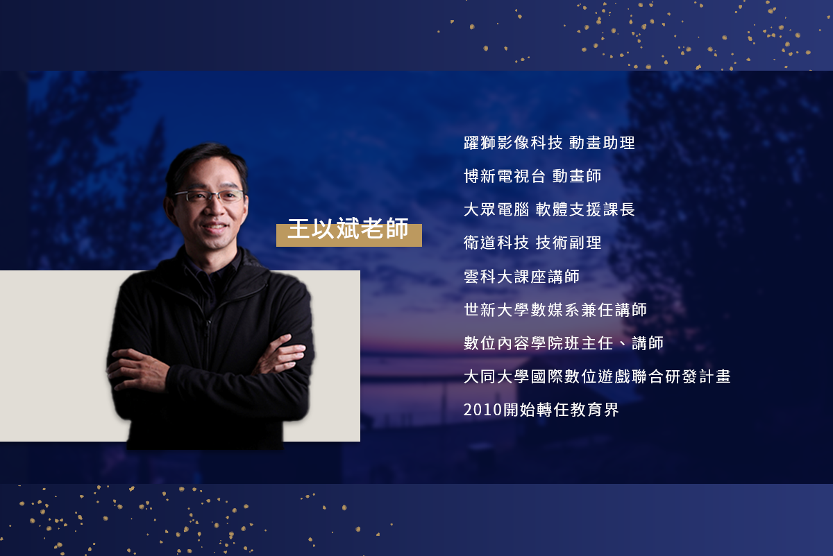 王以斌老師業界與教學經驗皆相當豐富,從事動畫產業及教學已經超過20年。過去曾在後製廣告公司、電視台擔任動畫師,後於軟體代理公司負責動畫相關產業的技術服務,也曾擔任過多場Maya新產品發表會講者。於2003年加入數位內容學院業界講師,負責電腦動畫精英班3D材質、燈光、演算和後製合成的教學,並獲選行政院數位內容人才培訓計劃「後製特效講師」,2004年獲選數位內容學院「國際種子教師」。