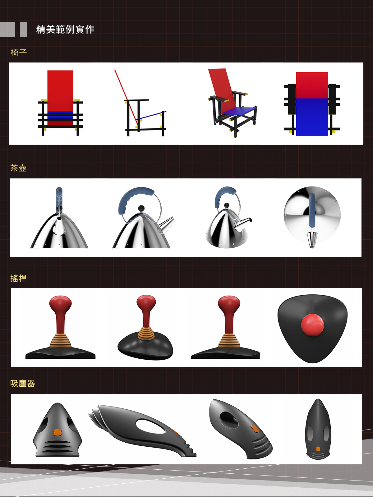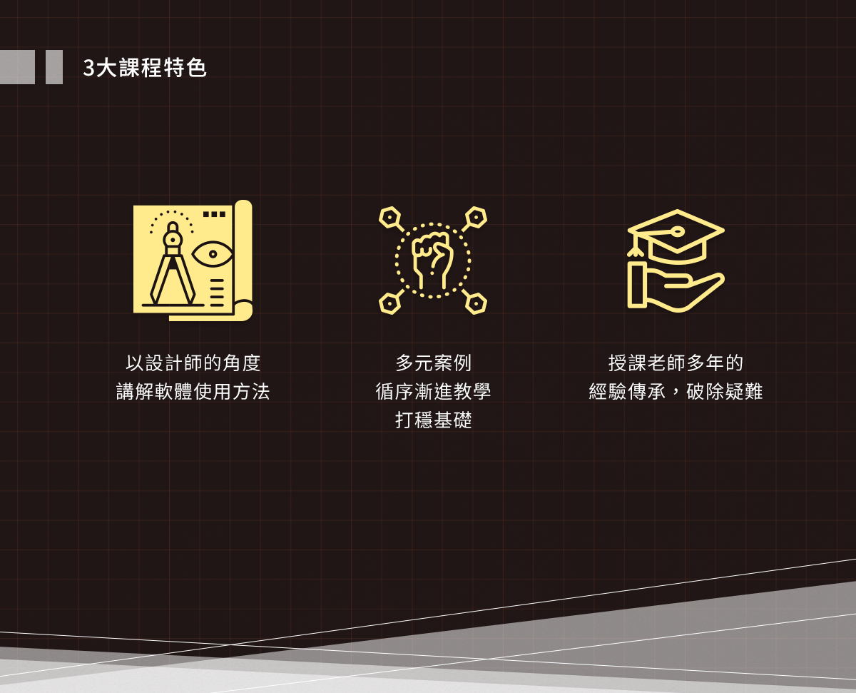 本課程除了教學Alias軟體基礎介面、操作與各種功能外,也以豐富且多元的範例輔助授課,讓你可以在了解軟體概念後,立刻實際上手操作,跟著老師清晰的教學步驟,一步步進行演練,了解各種範例的製作技巧,包含常見的椅子、茶壺、遊戲搖桿與吸塵器等,完成精美的範例成品。藉此,增加軟體的熟練度,且融會貫通,之後在自行發想與設計產品外型上,都可以靈活運用,做出心目中的產品外貌。