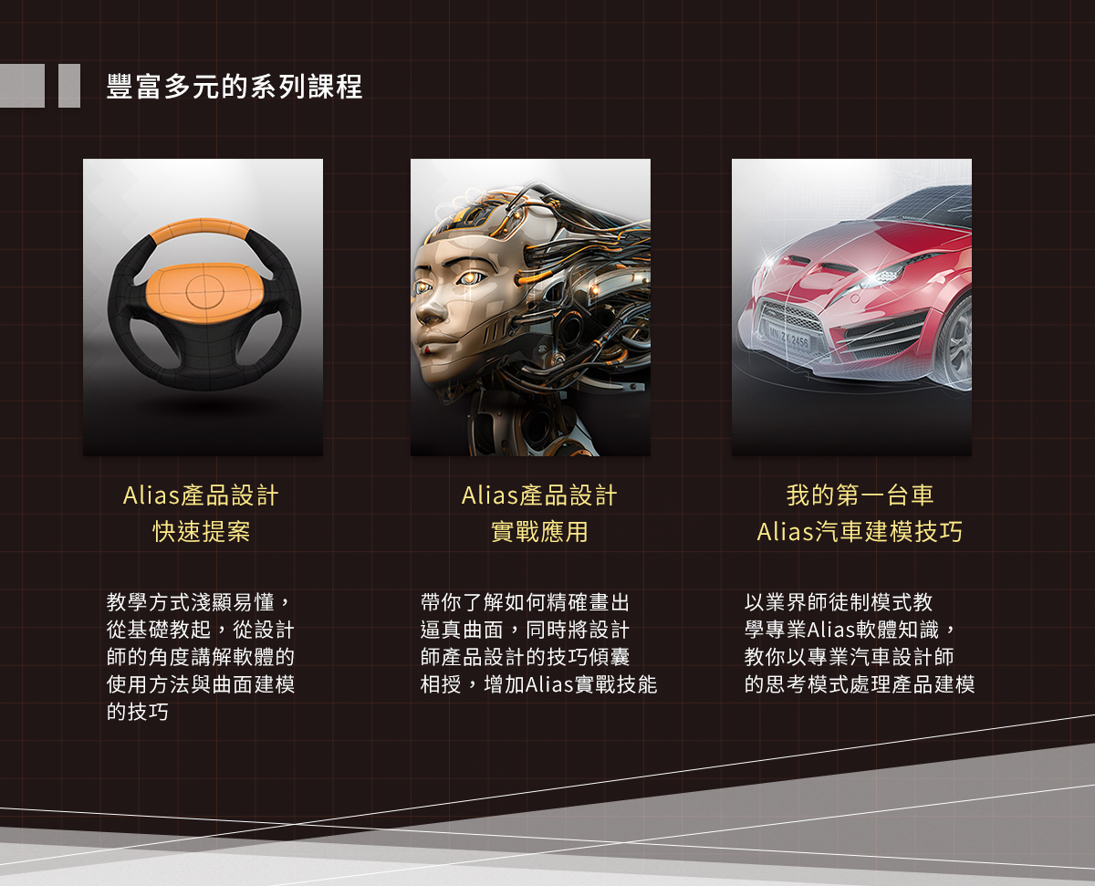 Alias工業設計軟體可完成各式產品設計草圖、建模、渲染等,是完全針對設計師直覺式使用的軟體。主要應用於工業設計、汽車設計以及產品設計等範疇,可建立出精細逼真的曲面效果。從概念的草圖繪製,再到產品的外觀建立,最後到產品的上色渲染,這套軟體全都能搞定,功能強大且實用,提升工作效率。本課程帶你了解產品造型的正確觀念、熟悉建模技巧,讓你能輕鬆分享設計產品的創意與熱情!