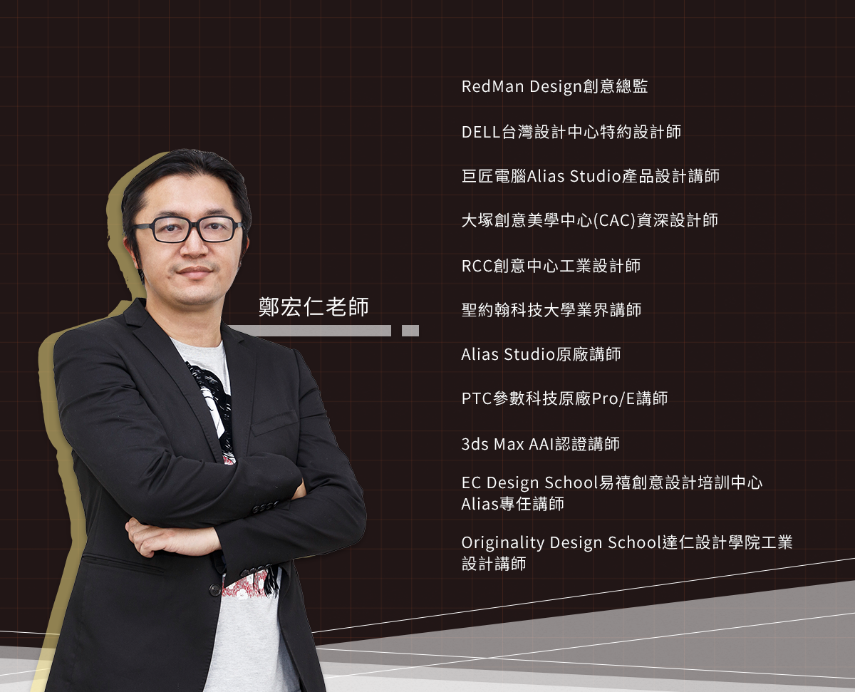 鄭宏仁老師現任REDMAN STUDIO創意總監,完成過許多國際級廠商的專案,亦曾擔任巨匠電腦產品設計類講師、CAC資深設計師、Alias Studio原廠講師。從處理Alias汽車等級曲面開始,到經營設計公司已有10多年的時間,業界經驗相當豐富,近年致力發展3D影像的照片級擬真技術。熟悉多套不同類型的3D軟體,並結合多年實務與教學經驗,將軟體的觀念與技巧以最為淺顯易懂的方式教學。
