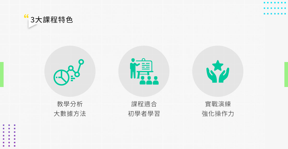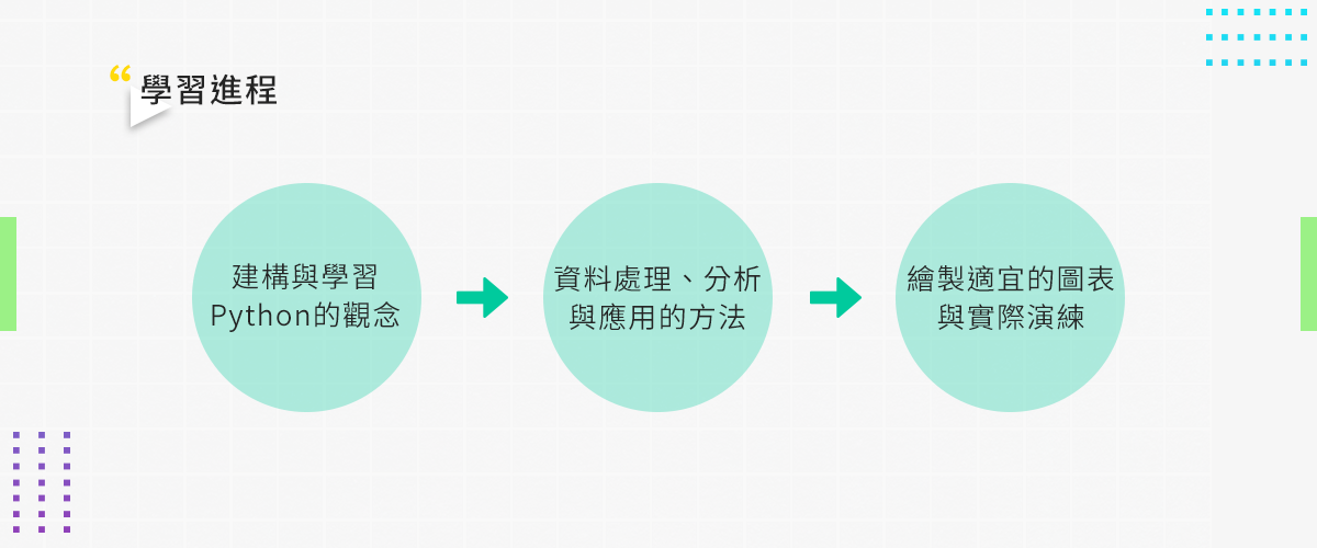 課程教學循序漸進,即使是初學也不必擔心。老師將從初步踏入Python的觀念建構談起,逐漸談到資料處理、分析與應用的方法,最後則教你繪製適宜的圖表與實際演練各種範例,讓你跟著老師的清楚講解輕鬆學習,逐步深入了解Python,並踏入大數據分析的領域。