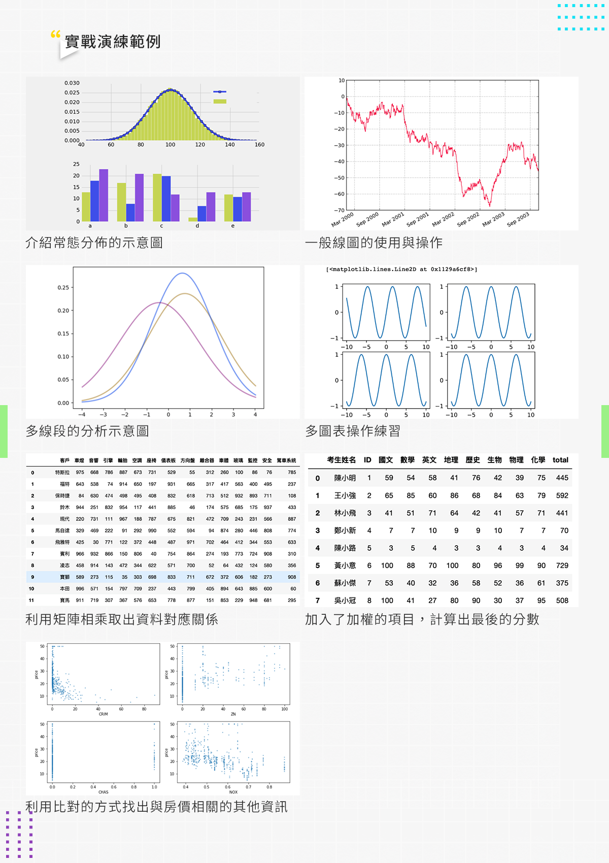 課堂上,以平日職場的工作項目來進行實戰演練,全都是職場常見的練習範例,學會就能立即運用在職場中。老師將帶你透過研究Excel資料來進入Python的殿堂,即便本身不具備資料庫基礎、網路語言或爬蟲能力等複雜程式的設計能力,都能無痛駕馭Python大數據分析!