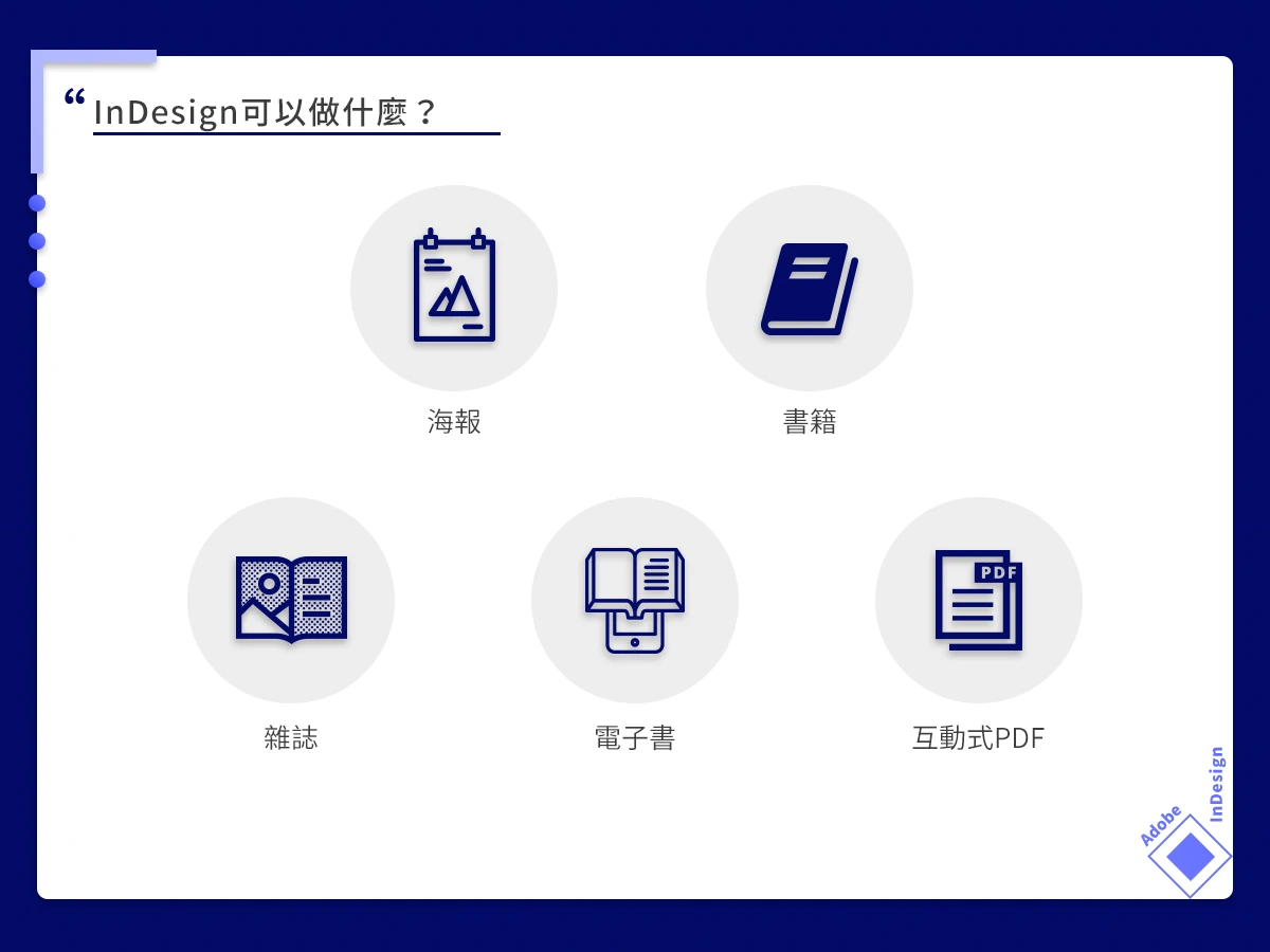 Adobe InDesign是Adobe公司開發的桌面出版(DTP)應用軟體,用於各種印刷品的排版編輯,具完善的數位排版功能,並提供行動裝置排版、網頁協同作業與完美印刷設計等應用。可將文檔直接導出為PDF格式,具有高級透明性能、圖層樣式、自定義裁切等功能。本課程教學Adobe InDesign軟體,進一步了解圖文排版的秘訣。