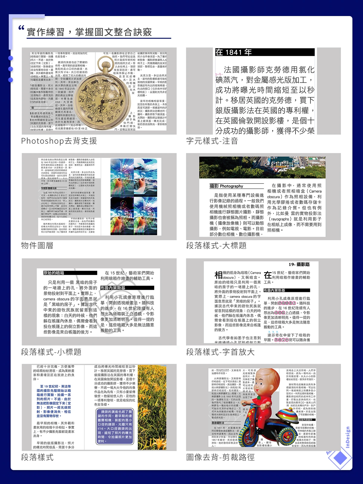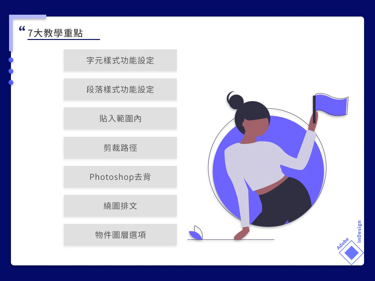 課程內容豐富多元,包含關於字元與段落功能的設定,教學方便套用的樣式設定,如字元、人地名、重點、旁注、注音、著重號、直排內橫排等。也包含關於文句與段落功能的應用,如設定段落標題、段落嵌線與陰影、句首放大、項目符號和編號等。此外,還有圖片處理與排版的功能,如應用InDesign貼入範圍內、剪裁路徑進行圖像去背、用Photoshop去背支援InDesign、以繞圖排文進行圖文整合等。紮實教學,告訴你完整的數位排版技巧。