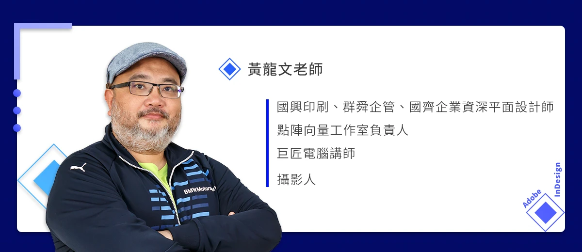黃龍文老師非常擅長影像處理領域,曾任各企業的平面設計師,現任巨匠電腦的講師,授課時數多達40000小時,教學經驗相當豐富。本身即專精於影像處理、專業攝影、繪圖設計、文件印刷排版等範疇,並於各領域皆有多年的授課經驗,此外更持有ACA認證——Photoshop、Illustrator、InDesign,擁有厚實的專業實力。目前教授的軟體包含:Photoshop、Illustrator、InDesign、CorelDRAW等。