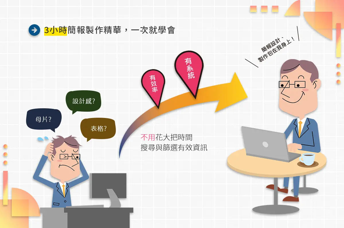 別擔心,本課程以3小時完整濃縮簡報正確的操作技巧,包含運用母片做出起承轉合、套用專業設計範本、調整表格等重要專業技巧,讓你有系統地學習製作簡報。