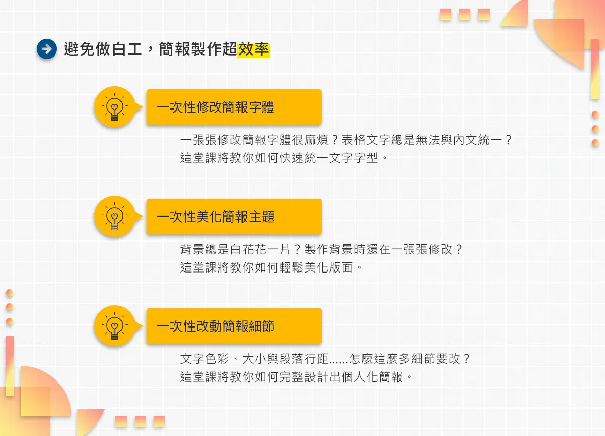 在職場上、學校裡,簡報的使用頻率非常高。在高頻率運用的情況下,如何效率製作就很重要了!本課程將告訴你高效製作簡報的秘訣,如此不僅能節省時間,還能減少手動操作的失誤,所以趕緊來check自己的簡報功力吧!