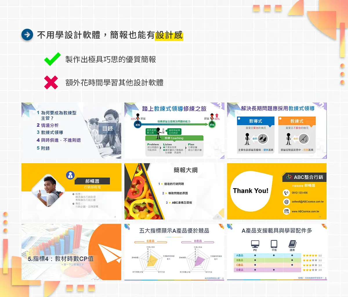 你不須額外花時間去學習設計軟體,也能學會簡報的基礎版面配置與設計,製作出極具巧思的優質簡報,展現簡報設計感。