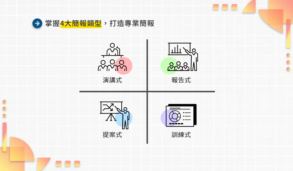本課程整理出4大常見簡報類型,分為演講式、報告式、提案式與訓練式,無論是對老闆報告,或向客戶提案,還是給一般民眾演講,全都得心應手,輕鬆成為全場焦點!