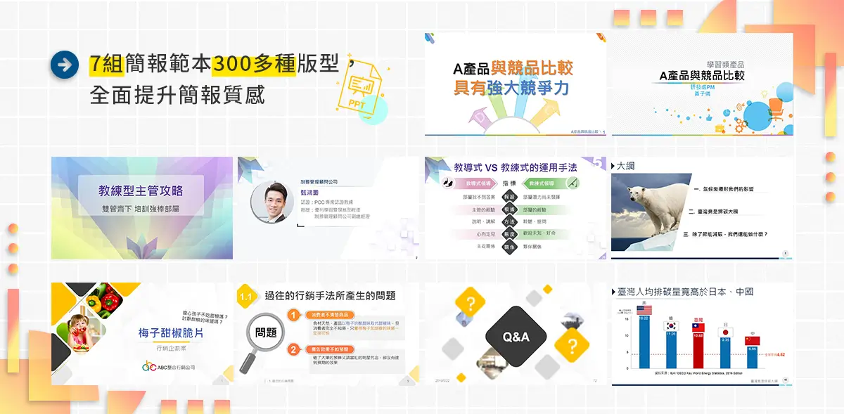 本課程精選7組由專業設計師所精心繪製的商用簡報範本,共包含300多種版型,課堂上也會直接教學如何使用。現在只要報名,即可免費獲得,全面提升簡報質感!