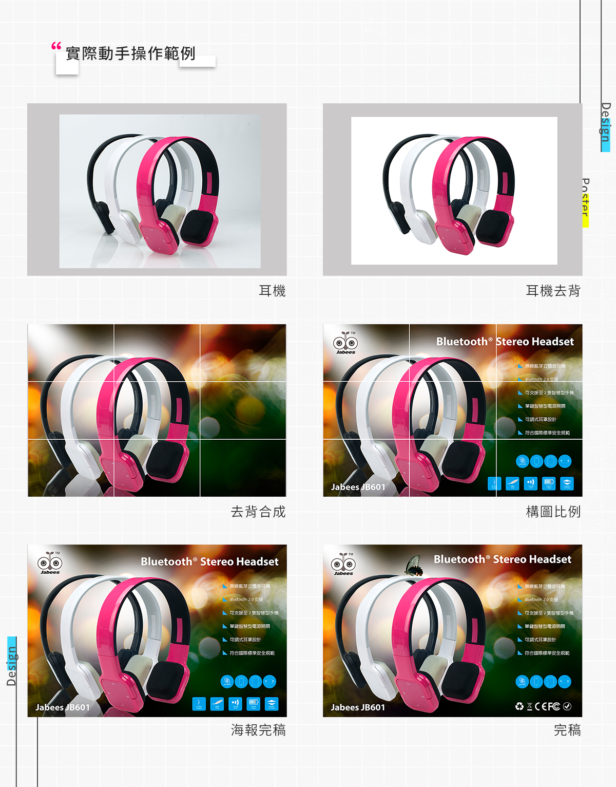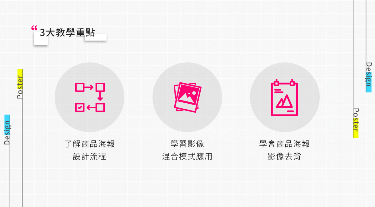 由於了解商品海報設計流程是動手進行設計前的必要動作,所以本課程將教學完整的商品海報設計流程,包含從設計分析、商品攝影、影像處理、排版注意事項到輸出打樣的完整過程,逐一講解與說明,讓你在自行操作前,能建構起海報設計的基本概念。進而在開始製作後,能依步驟進行,而不會迷失方向。