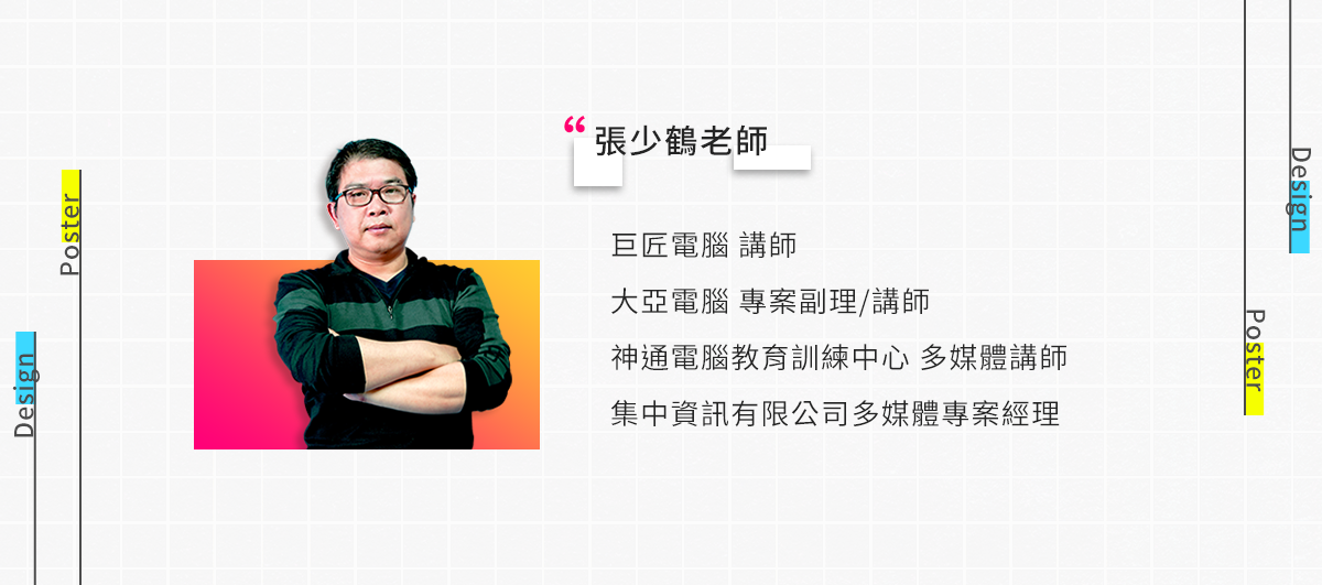 張少鶴老師致力於電腦教學資歷已超過13年,專長在Photoshop、Flash、Dreamweaver、Illustrator、Premiere等多種軟體。過去曾出版過《設計最前線:跨平台數位設計即戰技》、《設計最前線:視覺創意設計即戰技》設計相關書籍,通過的ACA國際認證包括:Photoshop、Flash、Dreamweaver與Mac Final Cut Pro。